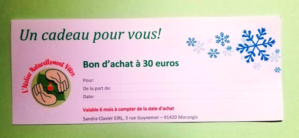Valable sur toute la boutique de l’Atelier Naturellement Vôtre !