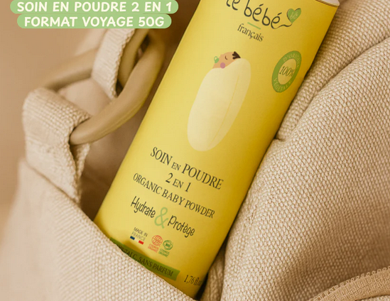 L’alternative au talc en format voyage, idéal pour prendre soin de bébé pendant les déplacements.
