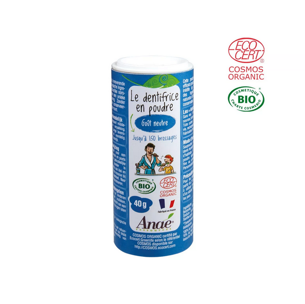 Le Dentifrice en Poudre Goût Neutre Anaé procure une sensation de brossage nouvelle à base d’ingrédients naturels et issus de l’agriculture biologique. Dentifrice avec une poudre naturelle innovante et efficace. Ce dentifrice Anaé est sans fluor ni conservateur. .