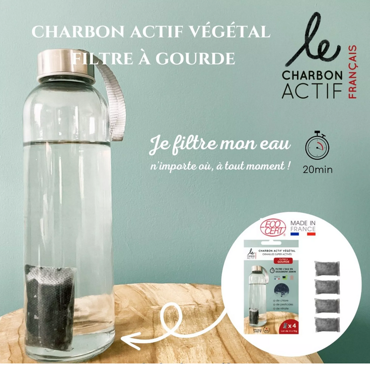 Le charbon actif végétal français est idéal pour filtrer et purifier l’eau courante des carafes et gourdes. Les granules de charbon actif super activés sont 3 fois plus adsorbants qu’un charbon actif classique. Il agit comme un aimant qui attire naturellement les particules toxiques vers lui que ce soit dans l’eau, l’air ou l’organisme. Il filtre l’eau en seulement 20 minutes contrairement aux bâtons de charbon qui agissent en 4-6 heures.