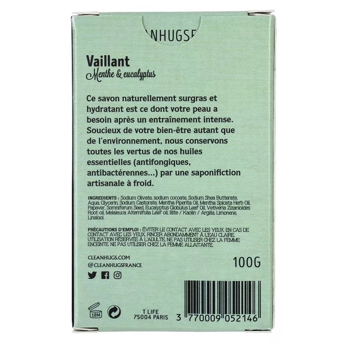 Le savon solide certifié bio pour homme « Vaillant » de Clean Hugs est conçu pour revitaliser la peau après l’effort. Grâce à sa formule enrichie en graines de pavot exfoliantes et en huiles essentielles de menthe et d’eucalyptus, il favorise la circulation sanguine et procure une sensation de fraîcheur intense.